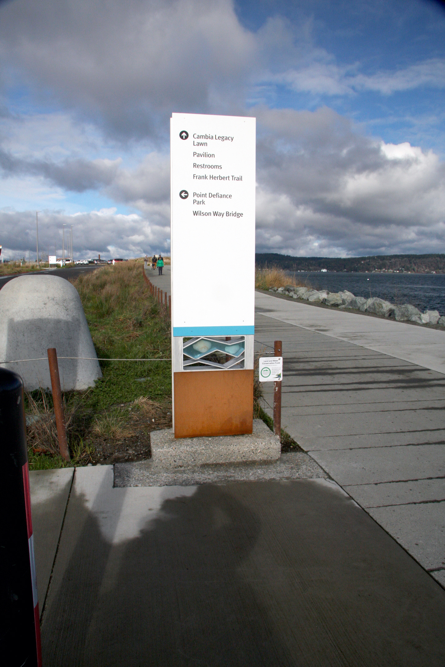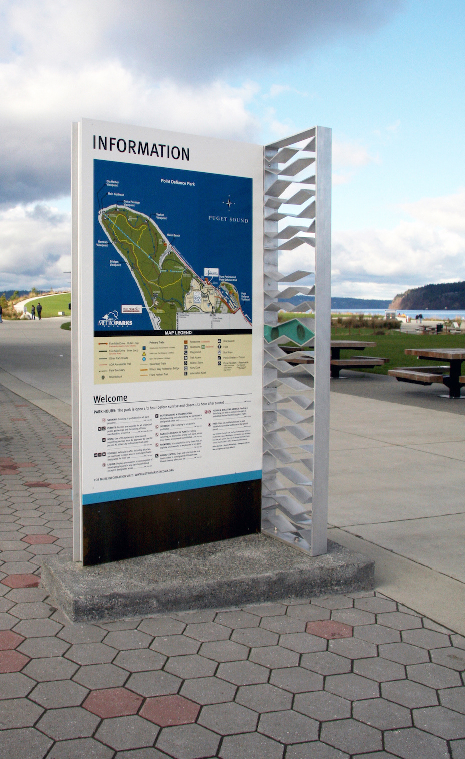 Dune Peninsula at Point Defiance is a 11-acre park built over a Superfund site. The setting along Puget Sound and the new landscape obscure what was once a slag waste depository for an adjacent copper processing plant. Metro Parks Tacoma and Site Workshop invited our team to create site identification, wayfinding and interpretive graphics for this new park.