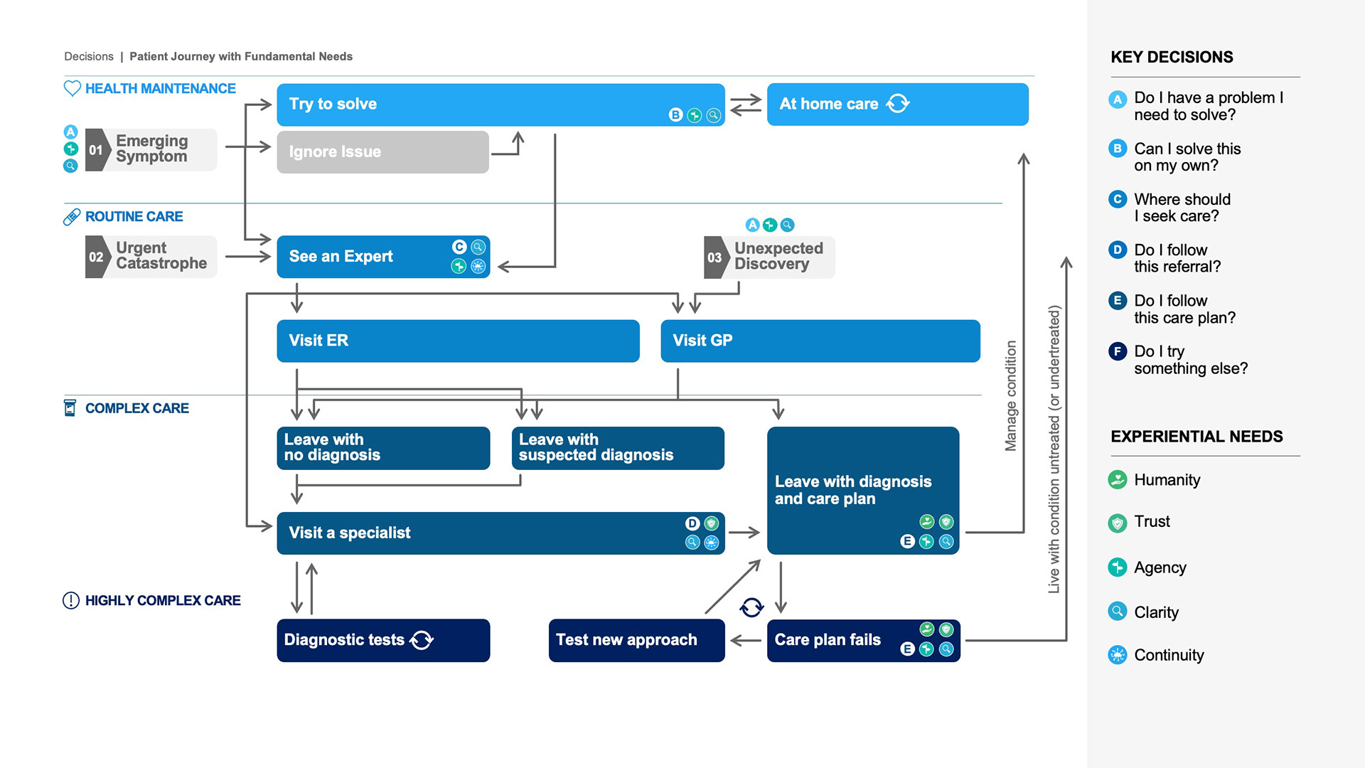 We mapped these key moments to the experiential needs in order to understand how our client should respond to patients along the path to well.