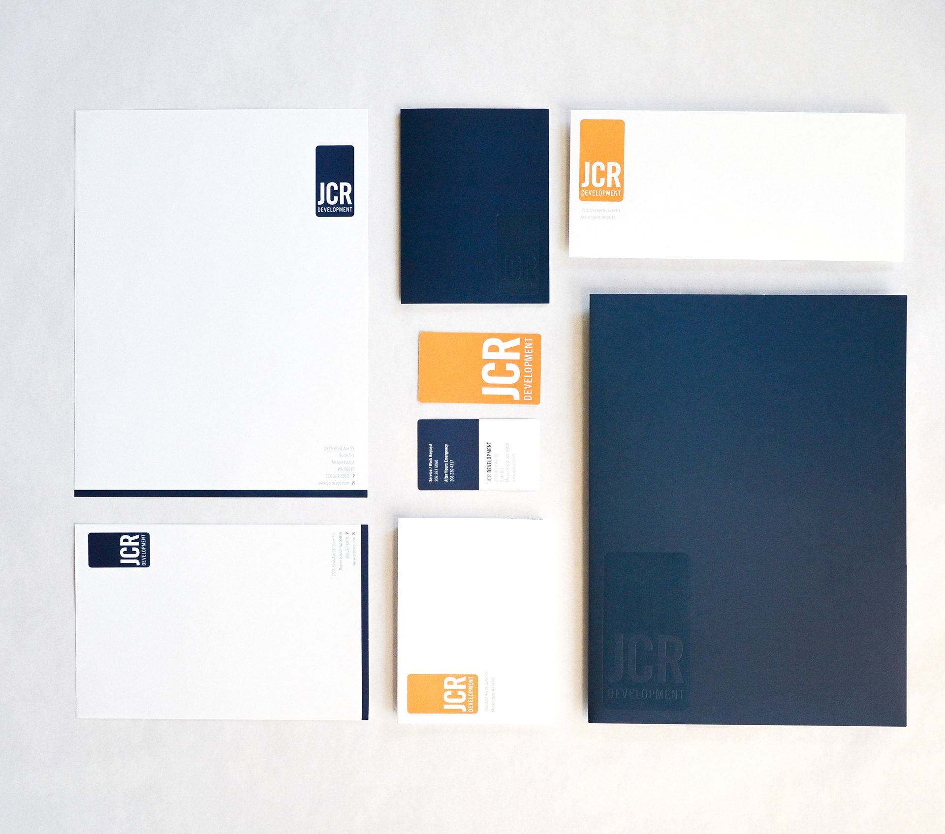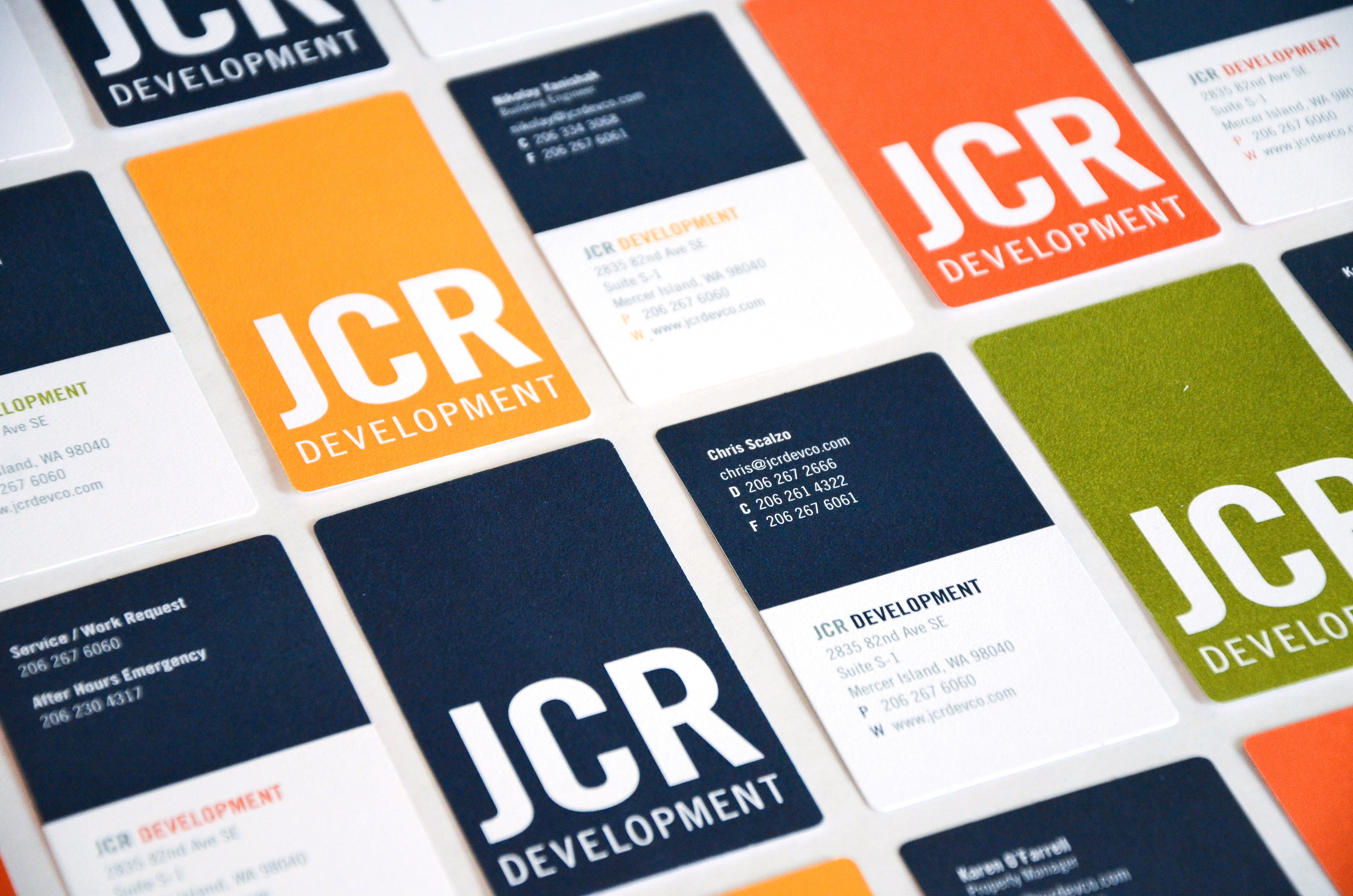 JCR Development is a family-owned real estate development company founded in 1975. The founder had recently passed away and the current leadership (his son, daughter, and management team, with input from his widow) wanted a fresh, contemporary image for the company. The new identity would be primarily used on the client’s letterhead package and migrate to their digital communications. The program included new signage for their new office space.